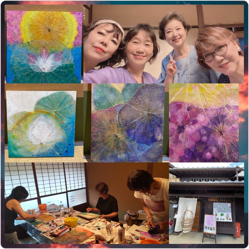 神佛に縁のある蓮の葉やインド菩提樹を使って、パネルに貼り、アクリル絵の具で着色します。